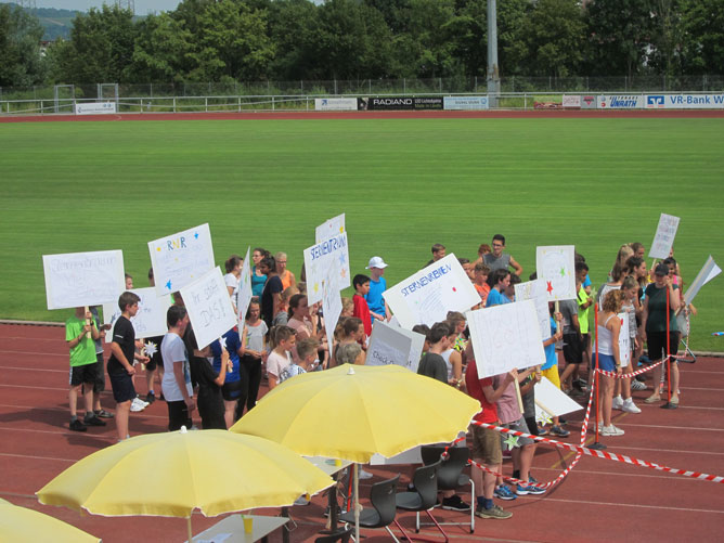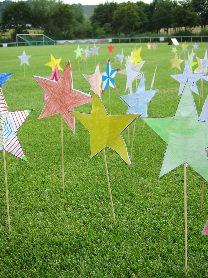 Im Rahmen der Schulhocketse fand dann am Freitag ein vierstündiger Sponsorenlauf statt, bei dem Schülerinnen und Schüler aller Klassenstufen, Lehrerinnen und Lehrer sowie zahlreiche Gäste ihr Bestes gegeben haben und eine Runde nach der anderen gerannt sind. Manche haben sich dabei so sehr verausgabt, dass sie sogar die Unterstützung des Roten Kreuzes, das den kompletten Nachmittag anwesend war, in Anspruch nehmen mussten. Auf unzählbar vielen Sternen haben die Siebtklässler ihre Motivation für den Lauf benannt. So stand da beispielsweise: „Helfen macht Freu(n)de!“ oder „Ich finde es wichtig, dass es die Kindertrauergruppe gibt!“, „Sie helfen sterbenden Kindern!“ oder „Sie würden auch und begleiten!“.